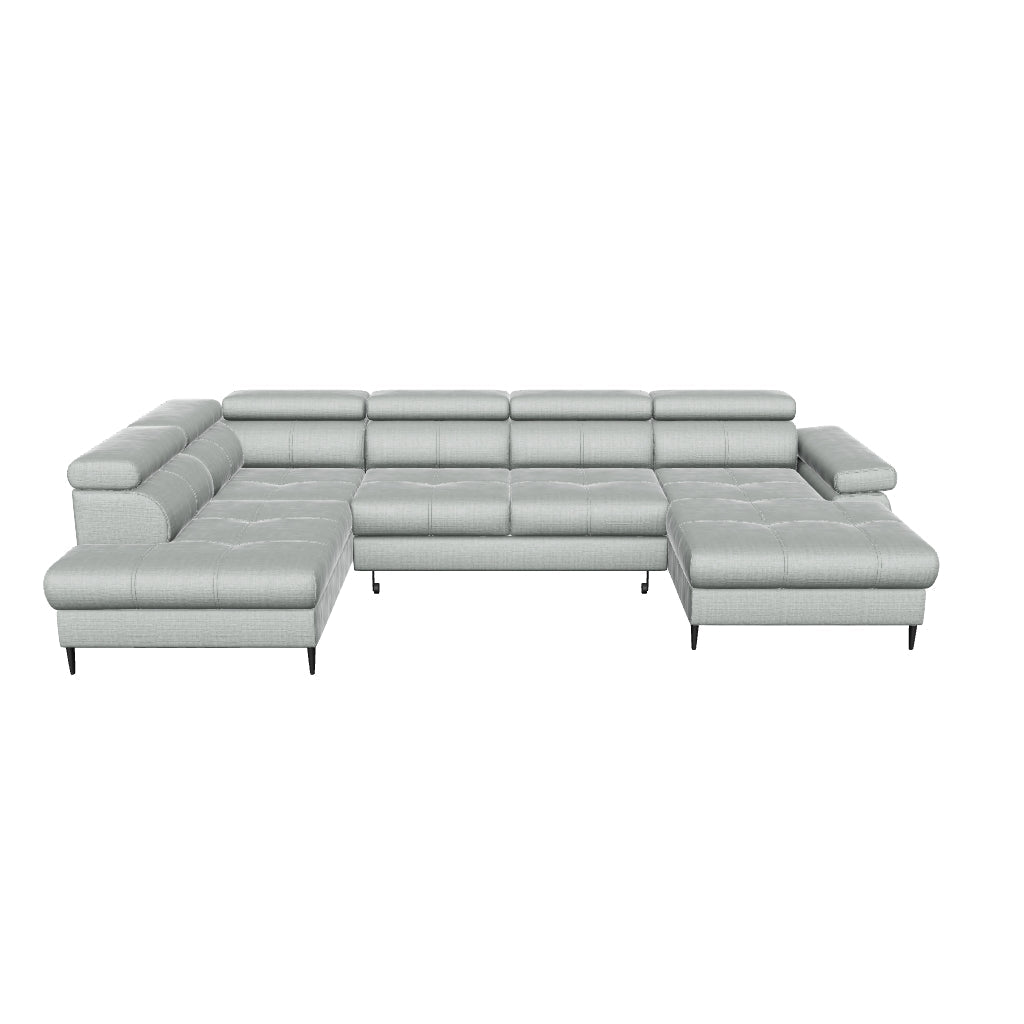 Das Ecksofa Córdoba III verbindet großzügige Sitzflächen mit durchdachter Funktionalität und hohem Komfort. Die Kombination aus Wellenfederung und PU-Schaum (30 kg/m³) sorgt für angenehmen Sitz- und Liegekomfort über viele Jahre. Verstellbare Kopfstützen ermöglichen eine individuelle Anpassung – ideal zum entspannten Sitzen oder Zurücklehnen. Der Delfin-Mechanismus verwandelt das Sofa im Handumdrehen in eine komfortable Schlaffläche von ca. 270 × 126 cm, während der integrierte Bettkasten praktischen Stauraum bietet. Elegante Metallfüße setzen einen modernen Akzent.