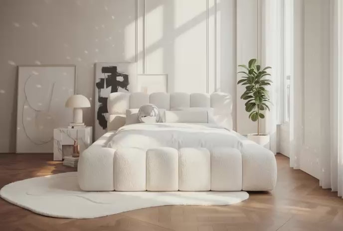 Das Polsterbett Boston vereint modernes Design mit hohem Komfort und praktischer Funktionalität. Der hochwertige Bouclé-Stoff verleiht dem Bett eine elegante, luxuriöse Optik und sorgt gleichzeitig für eine angenehm weiche Haptik, die dem Schlafzimmer eine stilvolle Atmosphäre verleiht. Die bodennahe Konstruktion auf dezenten Kunststoffgleitern verleiht dem Bett eine minimalistische Eleganz ohne sichtbare Füße und lässt es harmonisch in jeden Raum einfließen.