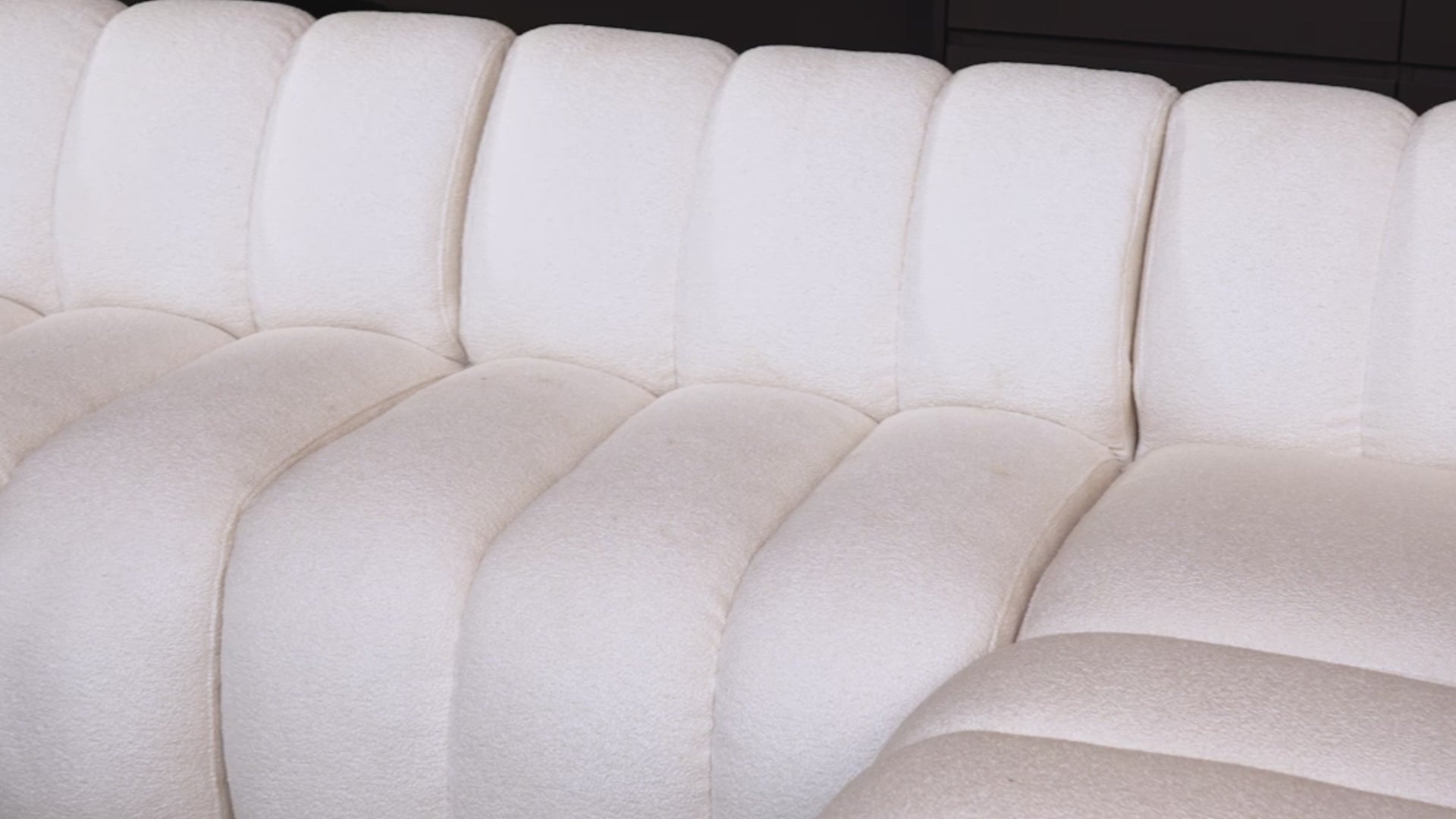 Der Bezug besteht aus Bouclé, einem weichen, strukturierten und modernen Stoff. Er ist strapazierfähig und pflegeleicht – gut geeignet für den täglichen Gebrauch.