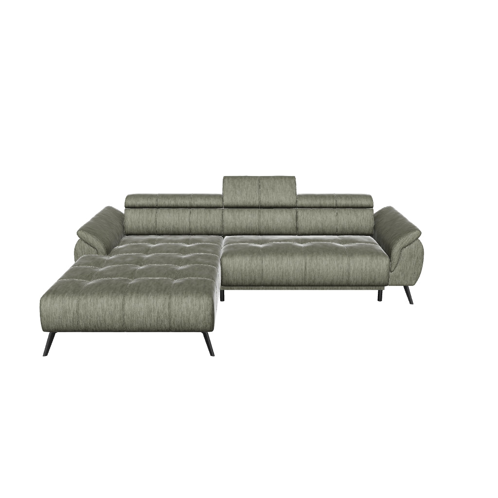 Das Ecksofa Genova I zeichnet sich durch außergewöhnlichen Komfort aus, dank profilierter Rückenlehnen mit verstellbaren Kopfstützen. Der stilvolle Look wird durch elegante Zweinadelstiche mit dezenten Zügen am Sitz, einer dekorativen Seite und hohen Beinen betont, die der Struktur Leichtigkeit und modernen Charakter verleihen.